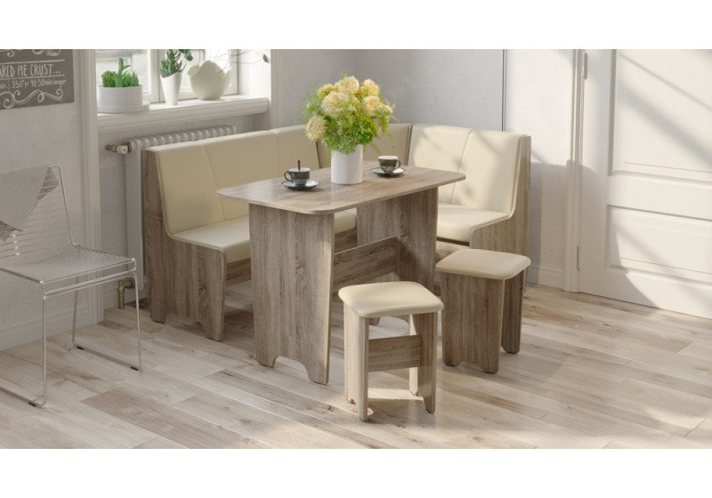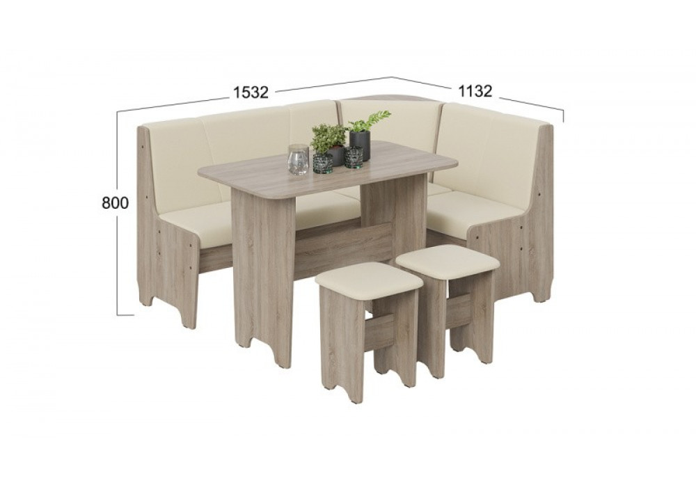 Габаритные размеры | Габаритная высота 800 Габаритная высота спинки 400 Габаритная длина 1 532 Габаритная ширина 1 132 Размеры стола Ш×Г×В: 1000×600×730 Размеры табуретов Ш×Г×В: 330×330×430 |